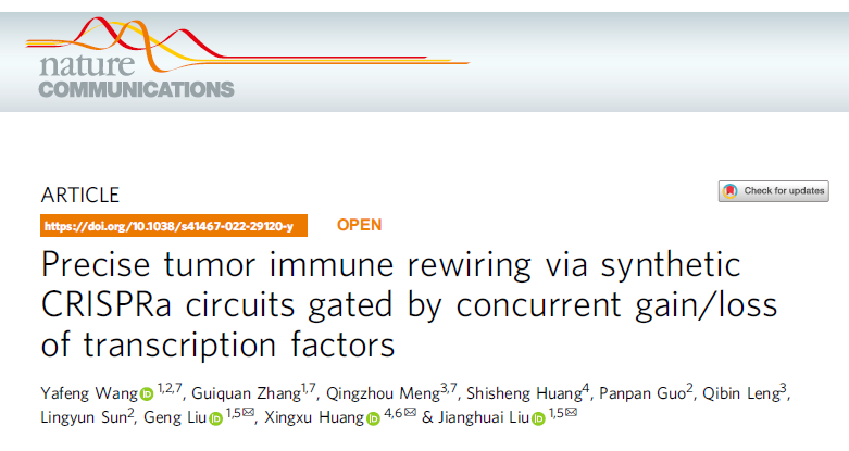 2022年3月18日,凯发k8官网医学院模式动物研究所、医药生物技术国家重点实验室成员团队协同上海科技大学、凯发k8官网市鼓楼医院等合作单位在《自然-通讯》杂志(Nature Communications)发表了题为"Precise tumor immune rewiring via synthetic CRISPRa circuits gated by concurrent gain/loss of transcription factors"的研究论文。该研究首次构建了响应肿瘤细胞中转录因子信号同时获得和丢失的CRISPRa基因环路,一方面能精准识别肿瘤,另一方面能恰当启动抗肿瘤免疫,产生特异及有效的治疗效应。
