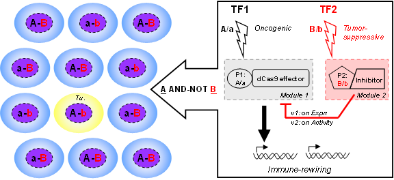 肿瘤的免疫治疗近来取得了巨大进展。进一步开发可定位于肿瘤病灶、而非全身性的免疫干预方法,将有望推动更高效低毒的免疫治疗。新兴的合成生物学为这种"智能化药物"的研发提供了可能,近年来基于基因组编辑技术的CRISPRa/i表观遗传调控工具的出现,更是为灵活实现肿瘤功能重编创造了条件。然而,目前许多识别肿瘤中高表达转录因子(transcription factor, TF)的合成基因环路缺乏严格的肿瘤特异性。因此,如何运用肿瘤中通常发生特异失活的转录因子(如p53)信息来精准门控肿瘤免疫重编是令人关注的问题。