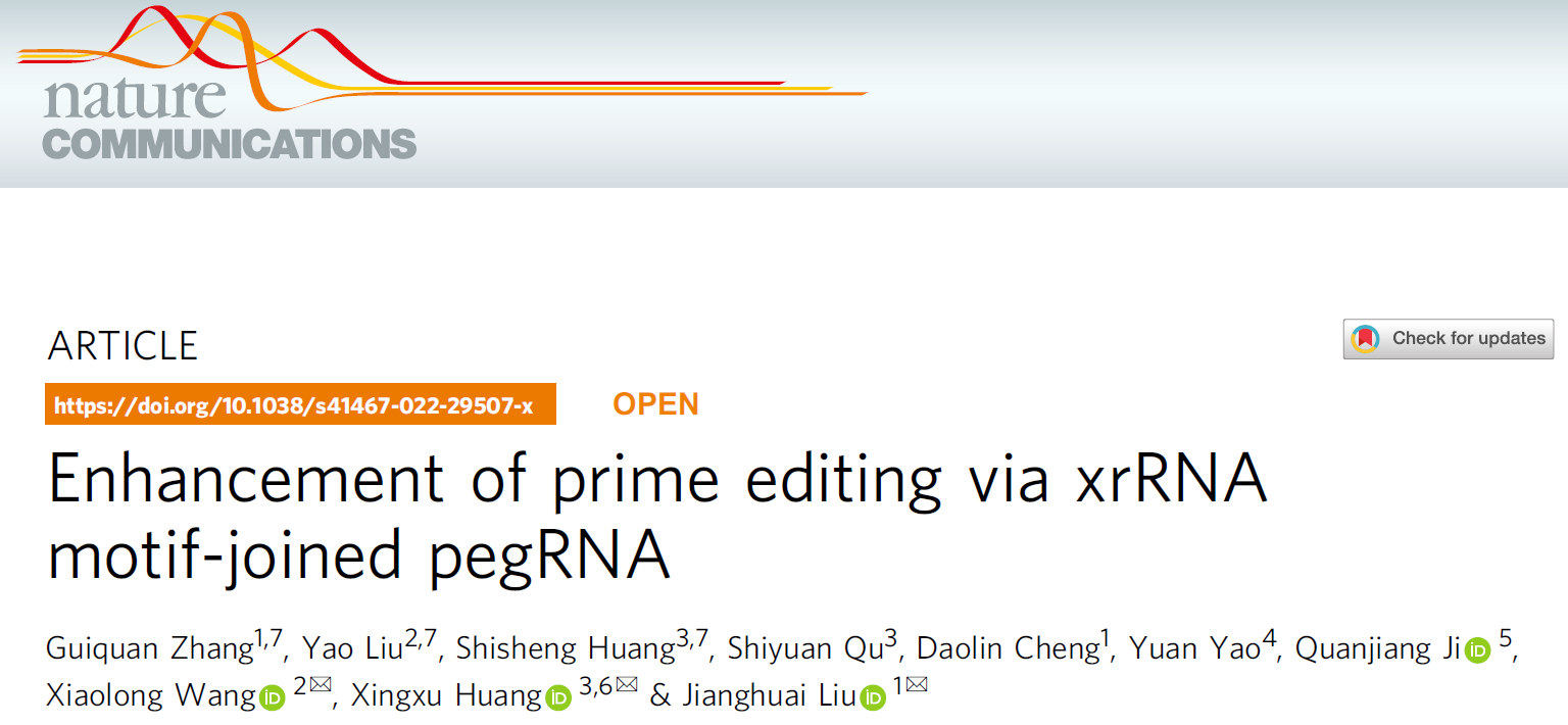 2022年04月06日,这篇题为"Enhancement of prime editing via xrRNA motif-joined pegRNA"的论文发表于《自然-通讯》杂志(Nature Communications)。该工作的第一作者(共同)为医学院模式所博士生张贵泉、刘尧(西北农林科技大学)和黄诗圣(上海科技大学);通讯作者分别为刘江怀、黄行许(上科大)与王小龙(西农)教授。研究工作受到科技部重点研发计划等项目的资助。