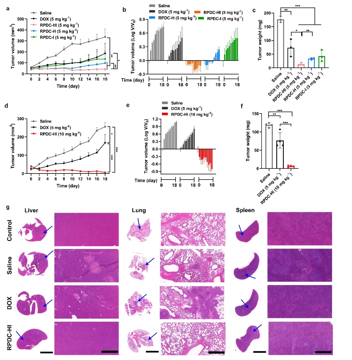 图4. (a-c)不同RPDC于裸药阿霉素在相同剂量(5 mg kg-1)条件下的肿瘤抑制情况,(d-f)提高注射剂量(10 mg kg-1)后的RPDC-HI显著缩小肿瘤体积,(g)不同处理条件下,肝肺组织中肿瘤细胞的转移灶以及脾脏的肿大情况。