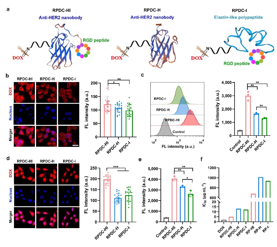 图1. (a)RPDC-HI、RPDC-H和RPDC-I的结构示意图,(b-c)RPDC-HI、RPDC-H和RPDC-I与MCF-7细胞孵育2 h以后细胞摄取的CLSM图像以及细胞核中药物的累积量的半定量分析(b)和细胞中药物累积量的流式定量分析(c),(d-e)RPDC-HI、RPDC-H和RPDC-I与MCF-7细胞孵育4 h以后细胞摄取的CLSM图像以及细胞核中药物的累积量的半定量分析(d)和细胞中药物累积量的流式定量分析(e),(f)DOX和不同RP、RPDC对MCF-7细胞的IC50值。