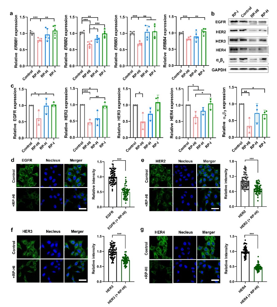 图3. (a)qRT-PCR显示RP-HI对HER受体的mRNA表达水平的调控,(b,c)WB分析RP-HI对HER受体的蛋白表达调控情况,统计结果由ImageJ分析得到,(d-g)免疫染色评估RP-HI处理后的细胞表面的HER受体的含量。