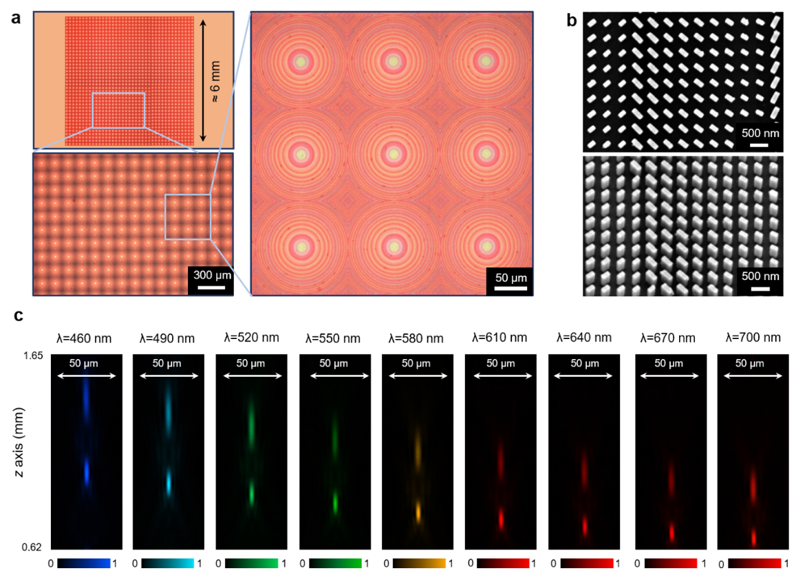 2(a)超构表面透镜阵列的光学显微图像;(b)SEM图像;(c)双焦超构表面色散效应。