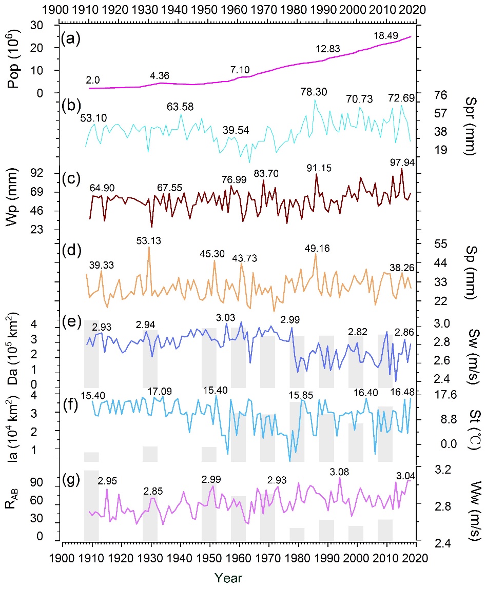图2. 1909-2018年新疆的(a) 人口 (Pop); (b) 春季降水 (Spr); (c) 冬季降水 (Wp); (d) 夏季降水 (Sp); (e) 夏季风速 (Sw), 沙漠面积 (Da); (f) 春季地表温度 (St), 灌溉面积 (Ia); (g) 冬季风速 (Ww) 和综合气候指数(RAB).