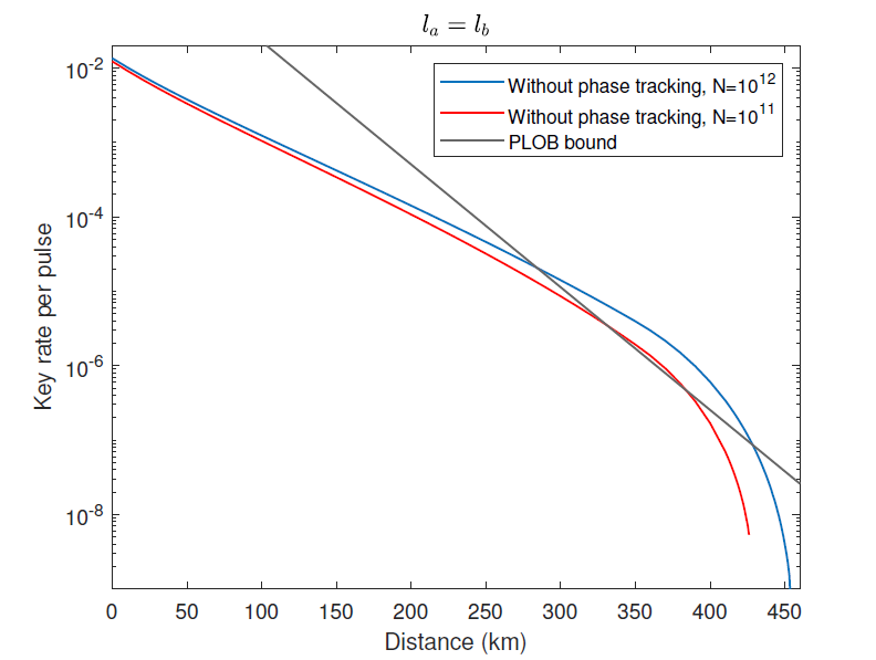 仿真结果表明,对于1 GHz系统,该协议在无相位跟踪的情况下传输距离可达450 km;同时去除相位跟踪和相位锁定技术后,该协议在有限密钥效应下可以在270公里的距离上打破无中继量子信道码率-距离限制。在城际距离,该协议的密钥率与原始MDIQKD协议相比提高了数万倍。例如,传输300公里其密钥率可达0.15 Mbit/s,足以执行包括音频和视频一次一密等各种任务。与此同时,由于该协议无需相位跟踪,其单光子探测器的所有探测计数容量都可以用于量子信号测量,使其在城际距离上能实现比使用同频强参考光相位跟踪技术的TFQKD协议高一个数量级的密钥率。