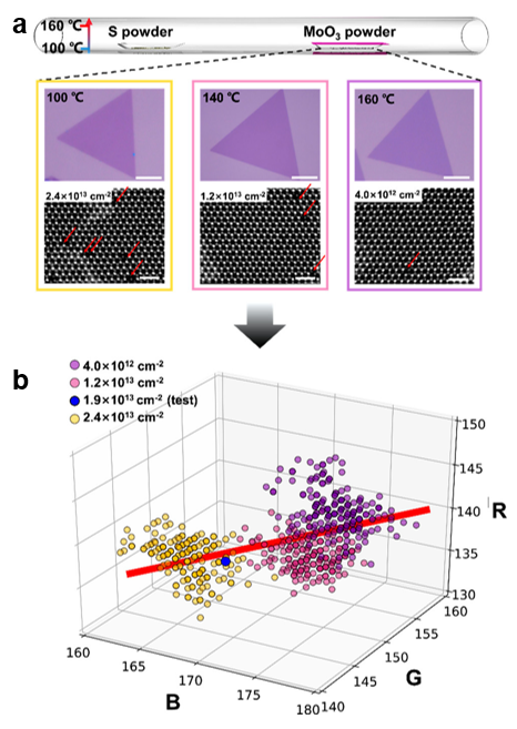 图4 MoS2缺陷浓度的识别。(a)不同生长温度的MoS2 光学显微镜图片和对应的透射电镜图;(b)不同缺陷浓度的MoS2在RGB颜色空间中的分布
