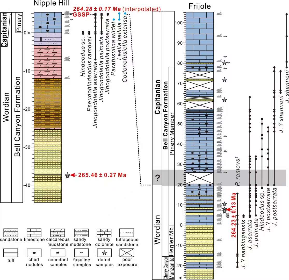 卡匹敦阶“金钉子”位于美国瓜达鲁普山地区Nipple Hill剖面,该剖面卡匹敦阶底界之上仅出露0.5 m地层,难以进行详细的长尺度生物地层学等的研究。为了解决这一难于克服的自然条件问题,研究团队在距离该剖面以西约2.9 km找到了新的含有这一界线的Frijole剖面,该剖面连续出露了从沃德阶中部至卡匹敦阶上部的地层,研究团队对该辅助层型剖面也进行了深入细致的研究。系统的CA-ID-TIMS高精度锆石U-Pb年代学研究卡定卡匹敦阶底界年龄被为264.28 ± 0.16 Ma,磁性地层学对比结果表明伊拉瓦拉反转(Illawarra Reversal) 位于卡匹敦阶底界稍下方层位,锶同位素化学地层学研究显示87Sr/ 86Sr比值在整个卡匹敦阶持续下降。无机碳同位素结果显示在沃德阶-卡匹敦阶之交没有明显的碳同位素漂移;综合对比表明,卡匹敦阶相当于特提斯地区以?类生物地层为基础建立的Midian阶的中上部。