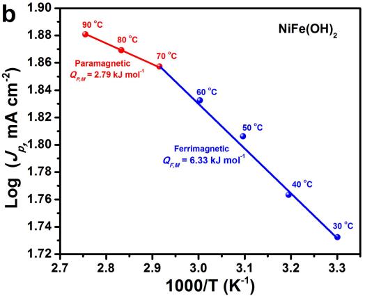 针对以上问题,课题组在对多能耦合制氢研究积累的基础上 (J. Am. Chem. Soc. 2021, 143, 9236; Frontiers in Chemistry, 2022, 10, 902814; J. Phys. Chem. Lett. 2022, 13, 49),提出基于热致物理效应实现高效热-电耦合的可再生能源制氢材料设计理念。以NiFeOxHy (NiFe(OH)2和NiFeOOH的混合物相)电催化剂作为模型催化剂,基于其较低居里温度Tc(70 ?C)设计出一种高效的热-电耦合水分解体系。磁学特性测试研究表明,NiFeOxHy电催化材料在70 ?C发生亚铁磁→顺磁相变(图2a-b),实现了顺磁态的Ni2+/Ni3+氧化和Ni3+氧化水反应,因此有效降低了电子转移势垒,在90 oC下NiFeOxHy的水氧化电流密度达到100 mA cm-2时的电极电位仅为1.392 V。基于热致磁相变的热-电耦合反应中,热不仅仅促进传质过程(Arrhenius方程描述的线性热-电耦合关系),同时也是维持材料电子态的重要参量,因此改变了电子转移势垒并诱发活化能突变(图3a-c)。如图4a所示,NiFeOxHy的亚铁磁-顺磁转变对低品位热较为敏感,从而使Ni2+到Ni3+的氧化具有较低的电子转移势垒。在此过程中,热贡献于电子自旋翻转,有效代替了电力消耗。此外,在顺磁态,低自旋Fe3+具有更多的电子转移通道,更加有利于Fe-O-Ni构型的电子交换相互作用,从而在Ni2+/Ni3+氧化和OER过程中实现高效的电子转移,并以几乎相同的KM和KOER显著加速氧化还原电对媒介的水氧化反应(图4b)。