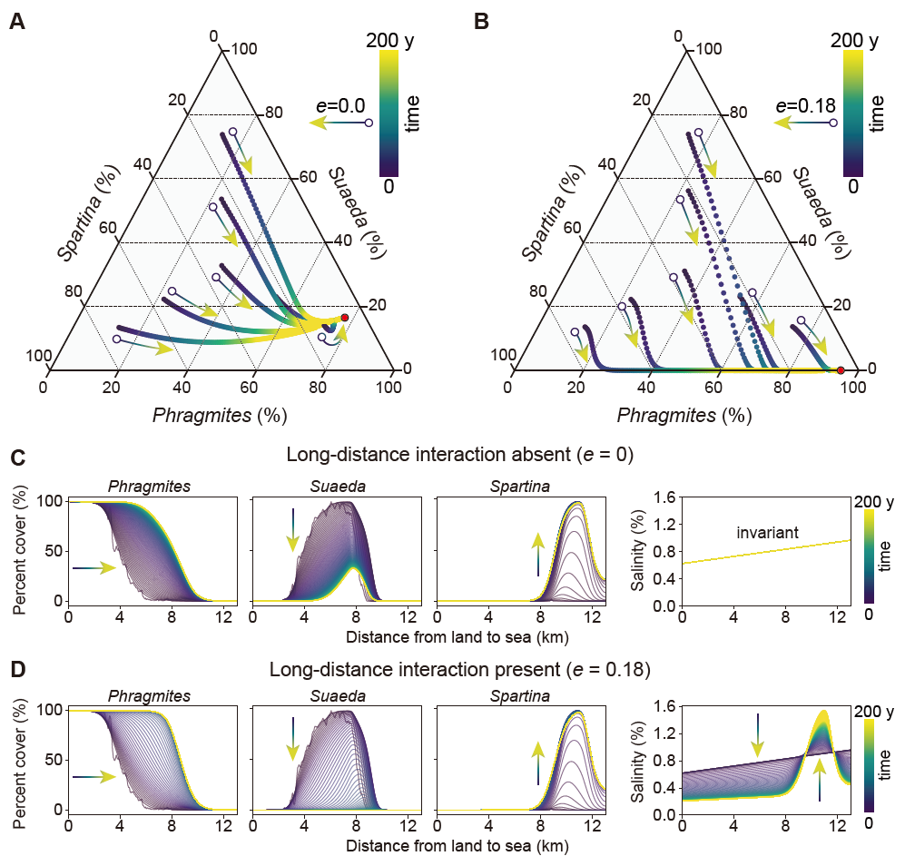研究团队首先通过解译江苏盐城湿地珍禽国家级自然保护区核心区40Landsat遥感影像发现互花米草定殖并占据低潮位区域5年后,中潮位的盐地碱蓬群落(图1面积开始表现出快速萎缩趋势有趣的是,碱蓬盐沼的萎缩并非由外来种互花米草直接侵占而主要是由高潮位的本地种芦苇扩张侵占导致。研究团队进一步通过综合分析植被分布、高程、沉积物、土壤盐分等数据,构建了基于种群增长、空间扩散、种间竞争和生物—地貌反馈等基本生态过程的微分方程理论模型,揭示盐分介导的长距离相互作用是近年来碱蓬盐沼快速萎缩的关键驱动机制(图2:米草具有发达的地下根茎系统,能够通过捕获沉积物促进低潮位的沉积过程从而导致高程的局部抬升,从而对潮水产生阻抑效应,减少中潮位的水淹时间和盐分输入;分析发现,这种作用虽然短期内较为微弱,但其长期积累效应可能导致中潮位土壤盐分下降到适合芦苇生长的临界阈值(与遥感观测的5年时滞期一致)从而显著改变芦苇和碱蓬之间的竞争关系,即具有较强竞争力的芦苇快速占据原先高度盐渍化(只能生长耐盐程度较高的碱蓬)的中潮位滩地,最终导致碱蓬盐沼系统丧失。模型分析表明,在数十年的时间尺度上,这种长距离相互作用最终能够深刻改变该区域滨海湿地的生态系统稳态和韧性