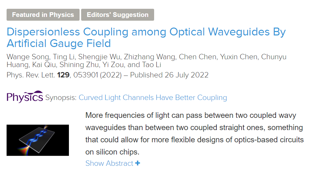 该成果以"Dispersionless Coupling among Optical Waveguides By Artificial Gauge Field"为题发表于物理学顶级期刊Phys. Rev. Lett. 129, 053901 (2022))上。文章同时作为Editors SuggestionFeatured in PhysicsPRL网站首页重点推荐。Physics杂志"Curved Light Channels Have Better Coupling"为题发表亮点报道。该论文通讯作者为凯发k8官网现代工学院李涛教授,第一作者是现代工学院助理研究员宋万鸽博士合作者包括上海科技大学邹毅教授该工作得到祝世宁院士的悉心指导。审稿人认为该工作"in an interesting way it is demonstrated how fundamental physics effects that were first discovered in the context of solid state systems with non-trivial topological characteristics, can be applied to improve existing photonic devices."该工作有趣地展示了如何将原先在凝聚态系统中发现的拓扑效应用于提升现有的光子器件的性能上相关技术已经申请中国发明专利获得授权专利号:ZL202010690095.X已申请英国发明专利(公开2602757该研究得到了科技部国家重点研发计划、国家自然科学基金委、凯发k8官网登峰人才计划等项目的支持。