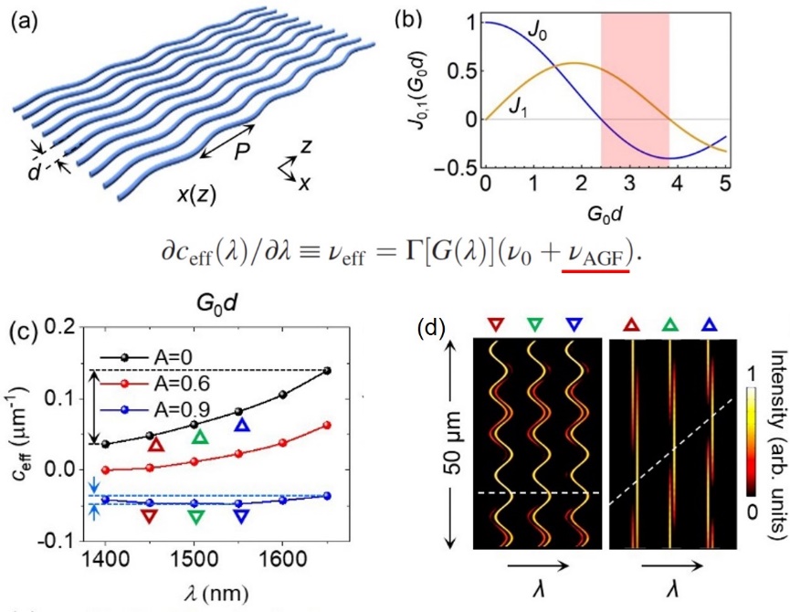 研究人员以常见的正弦弯曲的波导为例演示了这种无色散耦合现象,如图2所示。正弦弯曲的波导的等效耦合系数(ceff)可以用贝塞尔函数J0,可以有正、负及零耦合的调制。而考察耦合系数随着波长变化时,研究发现除了传统直波导色散项(图2公式右面0项)外,多了一项人工规范场AGF项(红线标注项),经过推导该项与贝塞尔函数的系数比值有关(J1/J0,二者反号时(图二(b)红色区域)有望与第一项抵消,从而获得无色散耦合。图2c)展示了通过参数调节构建的零色散效果(A=0.9)。图2d)则对比了不同波长下弯曲波导无色散的耦合与直波导耦合色散效应的理论计算结果,人工规范场设计的弯曲波导耦合长度完全保持不变,展示了其宽带工作特性。
