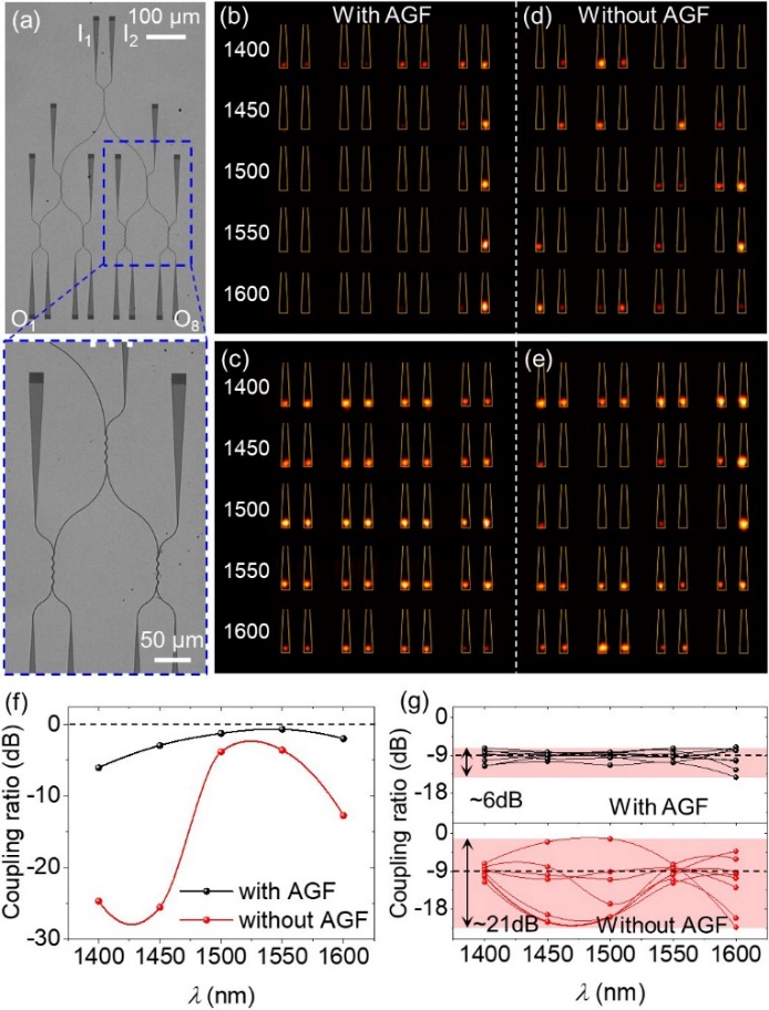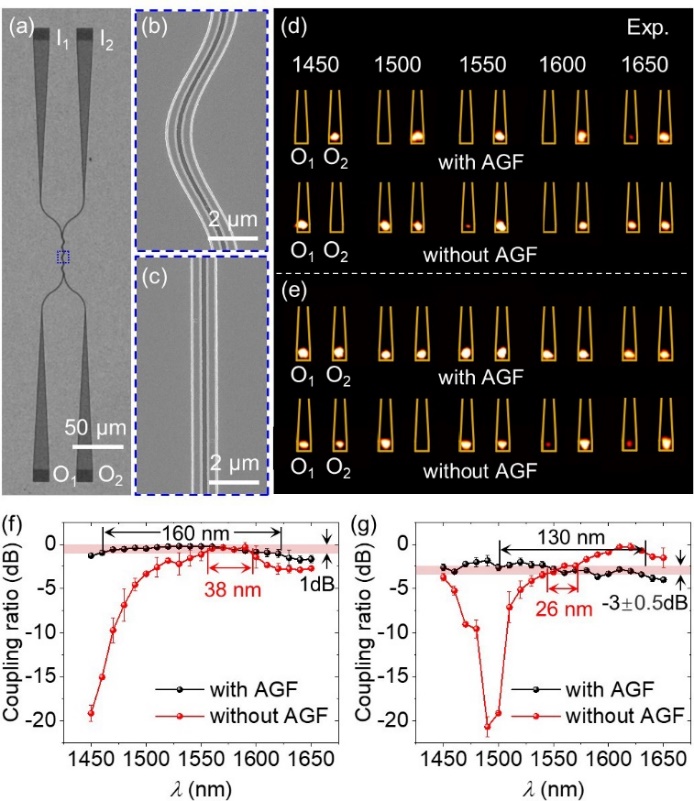 在实验中,研究人员加工了设计好的弯曲波导样品并以直波导样品作为对照。可以看出,弯曲波导体系对于不同波长都能保持良好的定向耦合器功能,而传统的直波导只在设计的1550nm可以工作,并表现出较大的波长依赖性(图3)。基于同样的原理,研究人员进一步设计和加工了一个5050分光比的弯曲波导样品,同样也表现出很好的宽带性能。根据实验数据,弯曲波导器件的1dB带宽约为160 nm,而传统样品仅为38 nm