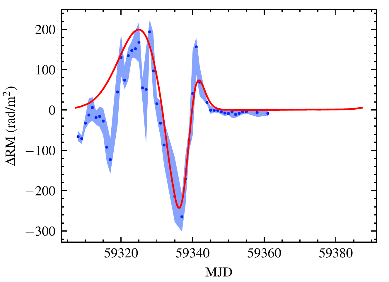 图2. 观测的法拉第旋转量演化(蓝色区域)和模型拟合(红色线)。
