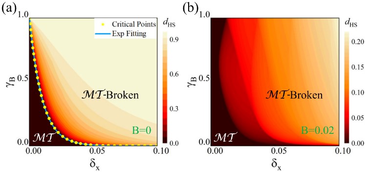 课题组基于正常粒子和狄拉克粒子(图3)模型对该问题进行了较为深入的研究,得到了若干有趣的物理结果:(1)在周期边界条件下,非互易格点的复数能谱会被磁场部分地抑制,在长波极限下体现为实数能谱(图4)。进一步研究发现,在长波极限下,粒子的准经典轨道在四维复数空间形成封闭轨道,其对应的Onsager-Lifshitz量子化条件保证了相应的实数能谱(图5)。(2)在开放边界条件下,磁场可以有效抑制非厄米趋肤效应,对其提供了一种有效的调控方式。(3)发现该体系具有内秉MT联合对称性,证明该对称性的自发破缺导致了系统发生非厄米相变,并讨论了磁场对相变的调控作用(图6)。(4)通过Hilbert-Schmidt平均量子距离定义了非厄米序参量,从而可以定量刻画非厄米相变中对称性破缺的程度。