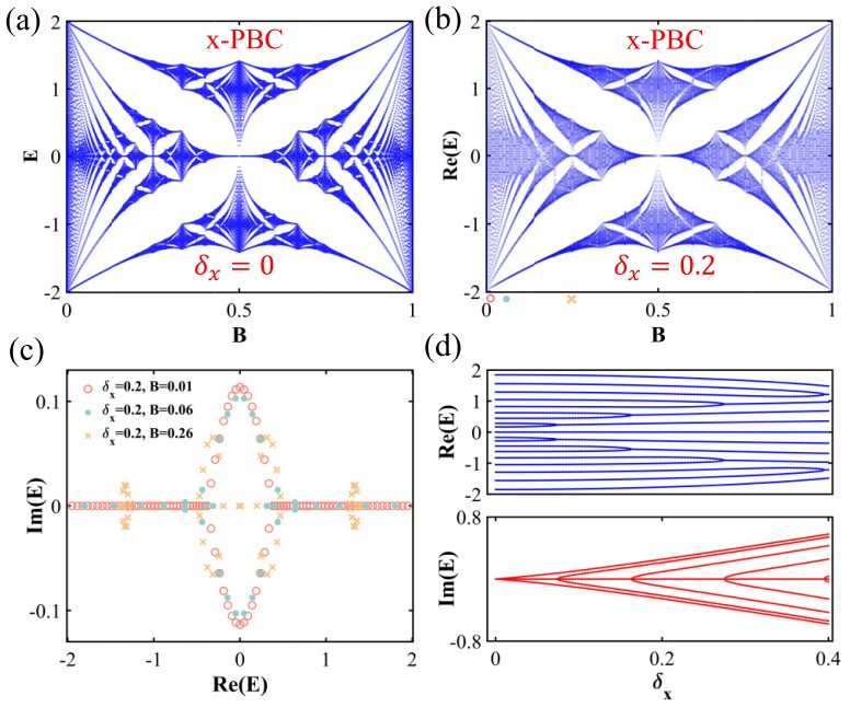 4:周期边界下(a)无非互易(b)有非互易跃迁时的能谱。(c)复数能谱随磁场