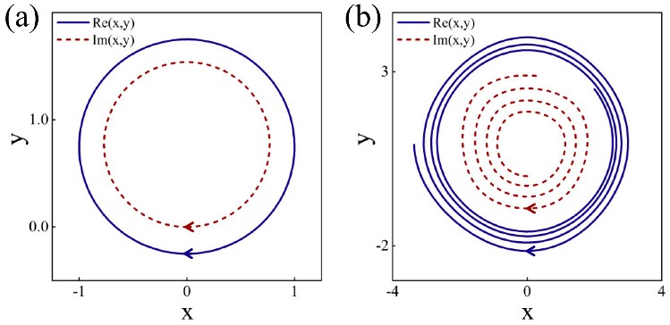 5:四维复数空间中(a)长波极限下的封闭轨道和(b)超越长波极限的开放轨道。