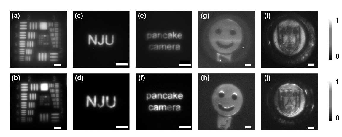 最后,研究人员在实验上加工了压缩比为1/3双面超构透镜pancake成像系统(见图4,成像距离由原先3h减至h,实验测量980nm波长下普通成像和pancake压缩之后的成像性能对比,结果显示其焦斑大小、斯特涅尔比及MTF性能都很接近5第一行则展示了pancake相机针对不同样品在不同情境下的成像结果,与普通超构透镜相比(图5第二行)其成像性能非常接近