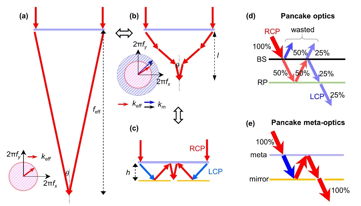 图2 pancake超构透镜的工作原理。(a)普通超构透镜的光线示意图,(b)多次波矢调制减小成像距离,(c)利用超构微腔进一步折叠成像距离;(d)传统pancake optics 能量利用示意图,(e) pancake meta-optics 能量利用示意图
