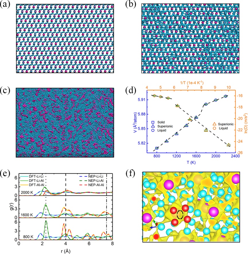最后,他们用自己参与开发的机器学习分子动力学方法GPUMDFan et al., J. Chem. Phys. 157, 114801 536 (2022)】详细研究了Li6Al在高温高压下的动力学行为,并构建了温度压强相图。模拟结果表明,随着温度升高,Li6Al从固态到超离子态再到液态的相变,其中超离子态表现为铝原子在晶格位置附近振动,保持固体行为,而锂原子则可以像液体一样在整个晶格中自由扩散。我们的计算表明Li6Al是一种高压电子化合物,其中Li的部分价电子局域在间隙空间并包围了Al原子形成独特的球壳状。通过计算超离子态的电子环境,我们发现锂在高温下没有改变其阳离子特性,因为它们的扩散只发生在被电子包围的开放管道中,其中四个锂原子在球壳状电子化合物上方的开放空间中以环机制扩散旋转,我们可以将其视为一种由电子化合物性质保护的超离子态。这种由电子性质引起的原子协同运动以前也被孙建教授等人在金属钙的高压相中发现过Phys. Rev. X 11, 011006 (2021)】。