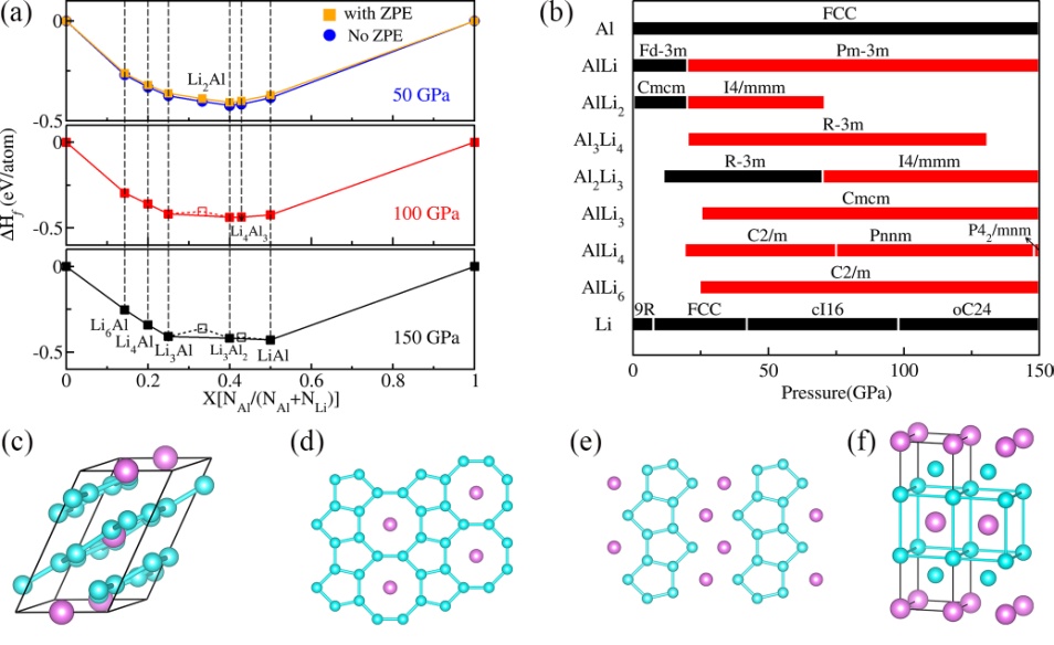 图1:(a,b)锂-铝二元相图. (c) C2/m Li6Al. (d)-(e) C2/m Li6AlCmcm Li3Al 的层状几何结构. (f) I4/mmm Li2Al