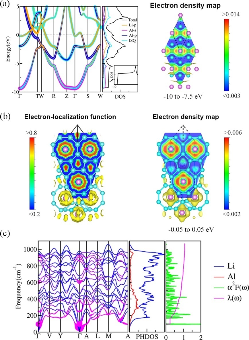 2 (a) I4/mmm  Li2Al50 GPa的态密度.(bC2/m Li6Al100 GPa的电子局域函数.(c) C2/m Li6Al150 GPa的声子色散、投影声子态密度以及积分电声耦合参数。