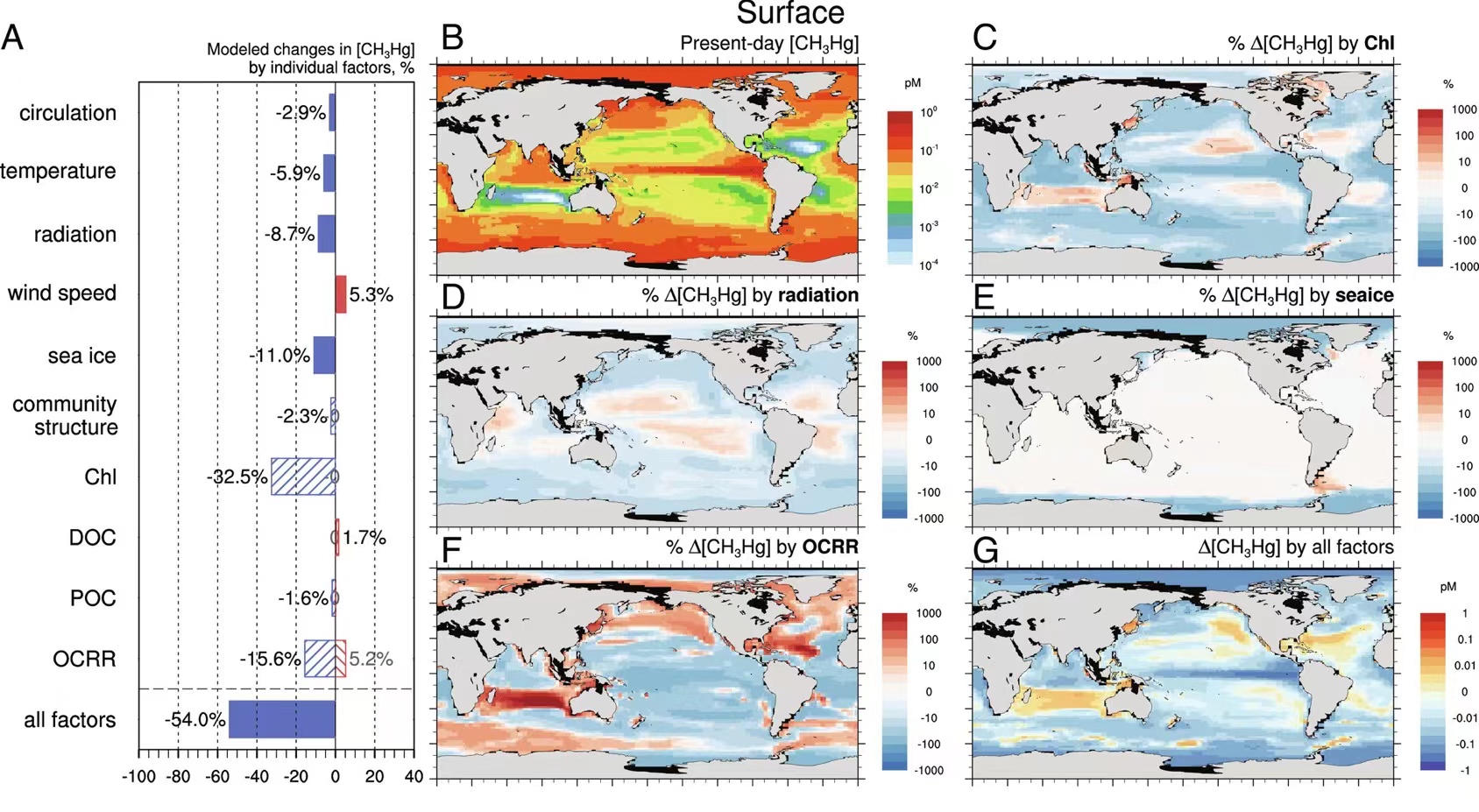 1气候变化的不同因素对表层海洋中海水甲基汞浓度的影响。