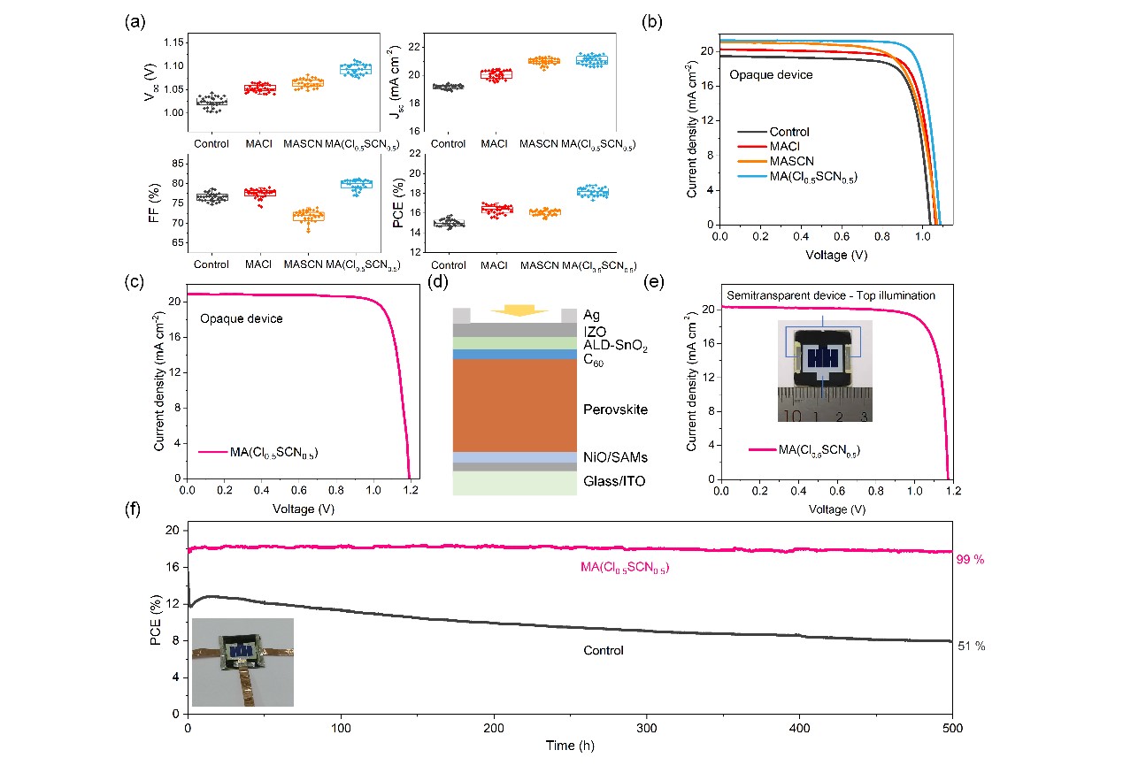 图3 不同添加剂引入的钙钛矿太阳能电池光伏性能。a) 30个不透明器件的光伏参数(Voc,Jsc, FF, PCE)。b) 最佳不透明器件(面积0.049 cm2)的J-V曲线。c) 经MA(Cl0.5SCN0.5)和表面钝化处理的最佳不透明器件的J-V曲线。d) 从IZO侧照射的半透明电池示意图。e) MA(Cl0.5SCN0.5)冠军半透明电池的J-V曲线(面积为1.05 cm2)。f) 封装的半透明电池在空气(相对湿度20 - 40%)中的最大功率点(MPP)跟踪。