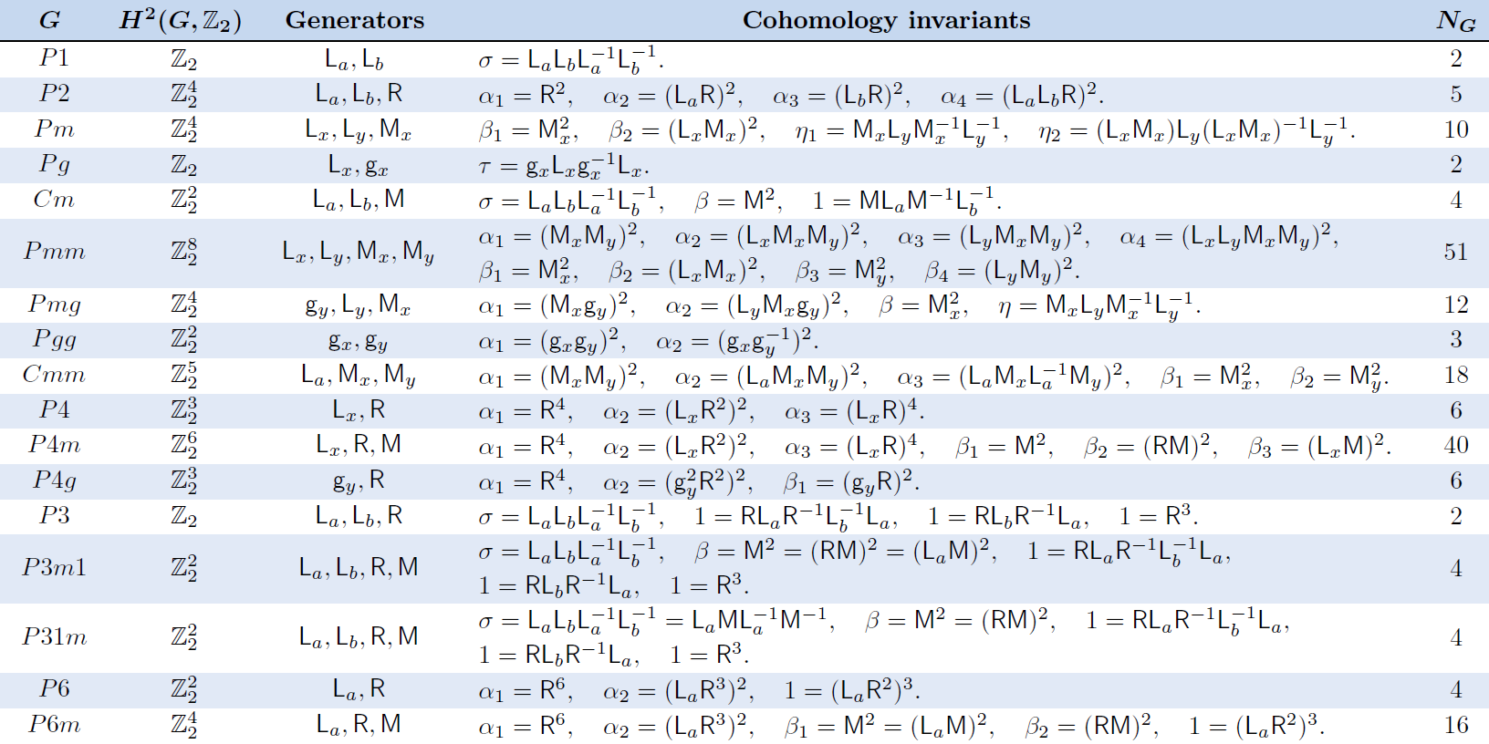 ?数学上,得到了二维空间群(即17个墙纸群)在时间反演不变规范场下扩展成的458 种Z2对称投影代数,并以生成元关系的显式表示。(表1)