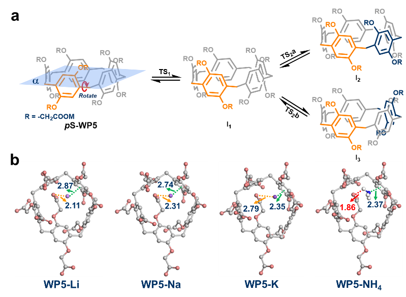 作者进一步通过理论计算研究WP5-LiWP5-NaWP5-KWP5-NH4势能面上翻转一个芳环(TS1)和翻转第二个芳环(TS2)的过渡态结构。过渡态区域结构的相对能量顺序为WP5-Li > WP5-Na > WP5-K > WP5-NH4,这与实验测定的能垒趋势定性一致。此外,通过对势能面扫描图中提取的能量最高点的结构进行分析,发现阳离子与柱芳烃间位的芳环存在由WP5-LiWP5- K逐渐增强的阳离子-p作用。WP5-KWP5-NH4的阳离子-p作用强度近似,而NH4+与柱芳烃侧链的羧基有氢键作用,这导致WP5-NH4的能垒低于WP5-K