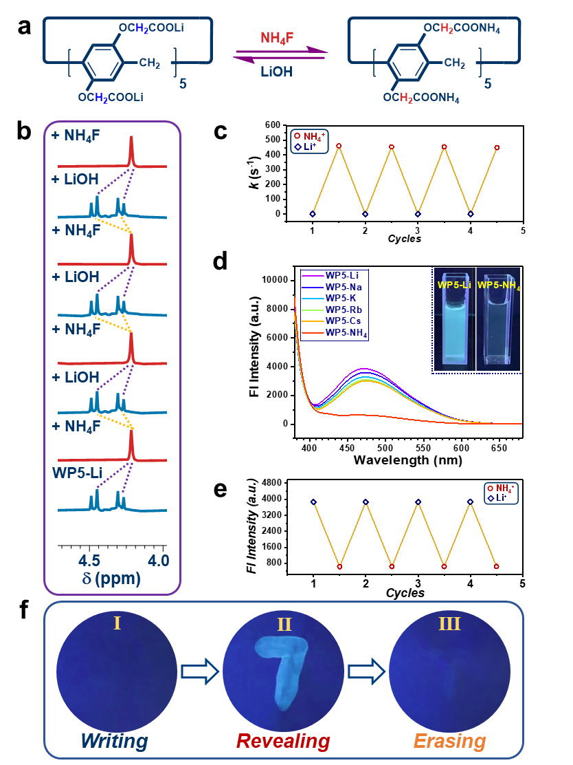 近期,强琚莉、林晨课题组与马晶教授课题组合作报道了一类通过抗衡阳离子调控的基于阴离子型柱芳烃(WP5-M)骨架构筑的分子转子平台,成功实现了对柱芳烃中芳环旋转运动的精确调控,通过对于柱芳烃芳环基元微观运动的调控,构建了新型荧光开关,并拓展了其在防伪墨水方面的应用。