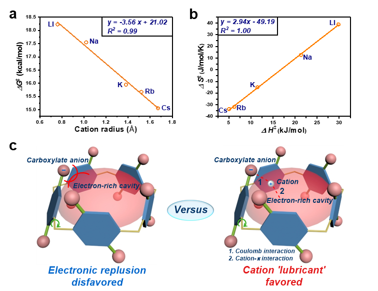 首先,作者通过变温核磁和Eyring图定量研究了不同抗衡阳离子(NH4+, Li+, Na+, K+, Rb+, Cs+)阳离子对阴离子型柱芳烃旋转能垒的影响。WP5-NH4的能垒最小,以至于受溶剂凝固点的限制,无法通过变温实验定量测量。对于碱金属离子,柱芳烃的旋转能垒与离子半径呈负相关,即阳离子尺寸越大,柱芳烃旋转能垒越低。这可能是因为在旋转过程中,阳离子充当‘润滑剂’插入羧酸根与柱芳烃空腔之间,与羧酸根产生库仑作用,同时与柱芳烃空腔的阳离子-p作用降低了羧酸负离子与柱芳烃富电子空腔的电荷排斥,进而加速对苯二酚环的旋转。尺寸大的阳离子,因其与柱芳烃空腔尺寸更匹配,呈现的协同‘润滑’作用更强。虽然NH4+与K+具有相近的离子半径(1.43 ?1.38 ?),而WP5-NH4WP5-K的能垒差异如此之大,可能是因为在WP5-NH4的旋转过渡态中,存在额外的氢键,从而对转子具有更强的‘润滑’作用。