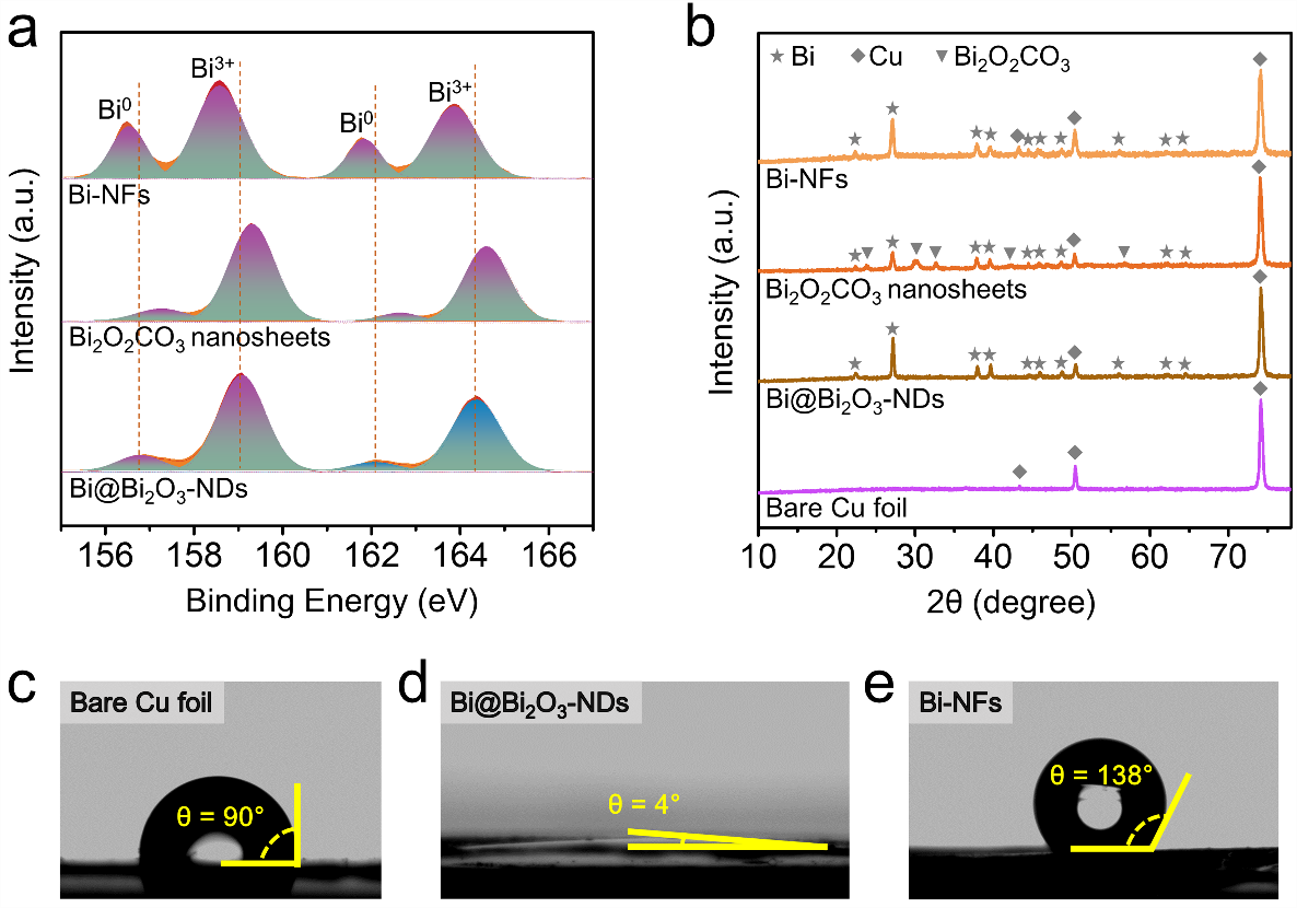 图3. Cu基底、Bi@Bi2O3-NDs、Bi-NFs和中间体Bi2O2CO3的XPS、XRD以及亲水性表征。