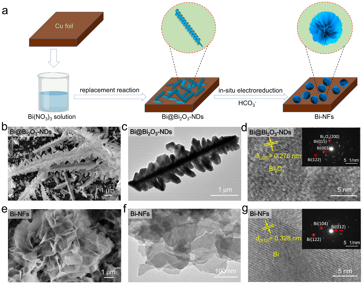凯发k8官网金钟团队设计并成功合成了由Bi@Bi2O3纳米枝晶(Bi@Bi2O3-NDs)转化而得的Bi纳米花材料(Bi-NFs)(图1),用于高效电催化CO2RR生产甲酸,实现了92.3%的高法拉第效率。此外,该工作探明了Bi基催化剂在电催化中以Bi2O2CO3为中间体的两步原位重构过程。进一步地,通过原位拉曼光谱,证实了催化过程中还原形成的0价Bi活性中心对于*OCHO中间体的选择性稳定吸附,这是实现高选择性的关键因素。