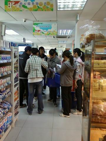 整个活动分为超市内场和外场两个板块。在活动开展之前就已经招贴传单发布报名消息,由短信报名产生了十五个小组。教育超市暂停营业,十五个小组依次进入超市内抽签,签上以问题的形式写上预定金额的信息。然后在一分钟之内在预定的金额之内挑选不同种类和不同口味的商品,且每件商品的金额不得高于预定金额的四分之一,否则不予结算。在超市里参加比赛的成员都以自己最快的速度挑选比对商品,在计时员的不断催促下,最后几秒钟每个成员几乎都已经晕头转向。一分钟结束,各组回到收银台计算商品的总额。超市的工作人员也参与其中,其乐融融,有一位还为整个活动担任起了摄影师傅。结账的时候还出了一个小岔子,有一位同学不知道从哪里进到超市的,要买一包面纸,惹得大伙都笑了。
