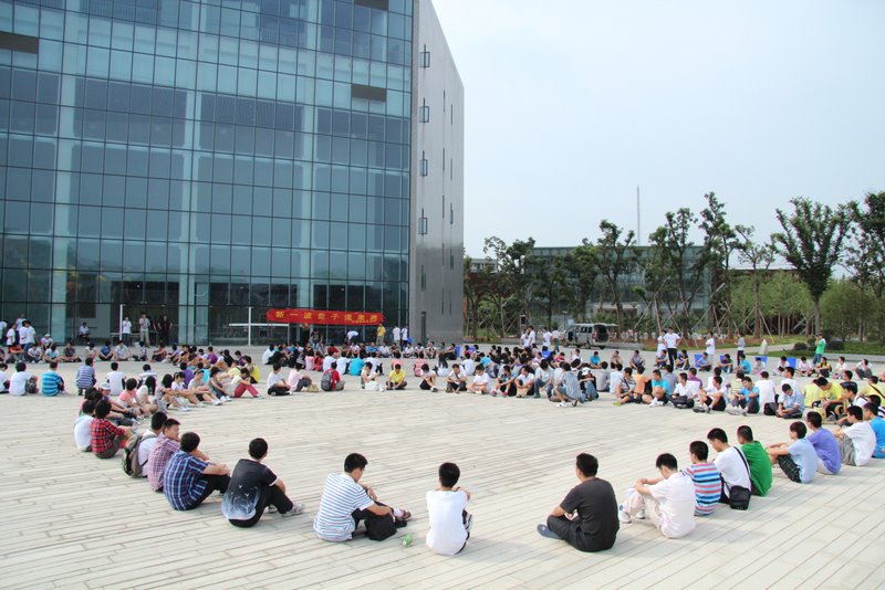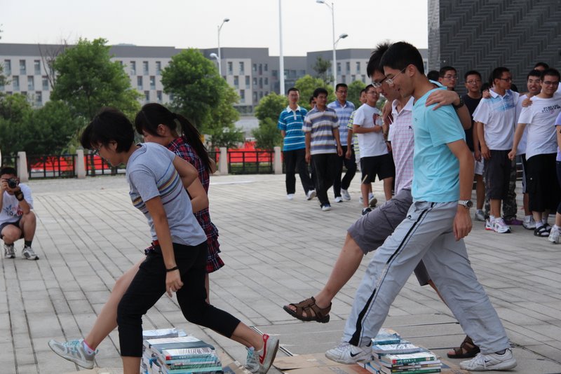 9.4日下午3点,大学生活动中心东侧广场上人声鼎沸、热闹非凡。物理学院在这里为新生呈现了一份特殊的开学大礼——齐心协力跃“龙门”、争先恐后受“洗礼”。