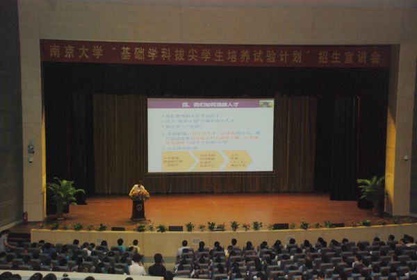 9月3日晚,我校在仙林校区恩玲剧场召开“基础学科拔尖学生培养试验计划”(以下简称“拔尖计划”)2011级新生招生宣讲会。教务处陈建群处长,团委王靖华书记,学生工作处姜辉副处长,教务处张亚权副处长、赵志宏副处长,“拔尖计划”各学科方向负责人以及拔尖计划管理办公室相关老师参加了招生宣讲会。宣讲会由教务处赵志宏副处长主持。本次宣讲会座无虚席,吸引了2011级新生和家长千余人前来参加。