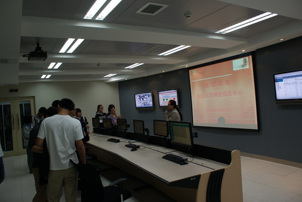 在全校网络监控大屏前,网络信息中心网络部的老师向大家讲解了校园网的架构和实时监控系统:每个楼每一层的每台设备都在中心的监控下,一旦出现停电断网等故障,或者中毒环路,中心的工作人员第一时间知道并给予解决;对于客户端问题求助,中心提供从早8:00到晚22:00的现场服务,及时帮助解决。在数据中心机房,系统部的老师向来访者讲解了数据中心机房的作用。(网络信息中心)