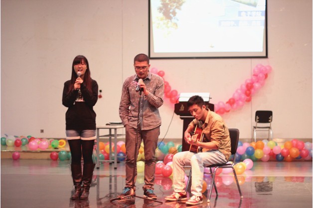 一开场,政府管理学院的陈子烨同学,以一首深情款款的韩语歌曲——《海上的公主》拉开晚会序幕。紧接着,开场游戏爆气球吸引了同学们踊跃参加。有背靠背运球的,也有头抵头运球的,正所谓“男女搭档,干活不累”,场上配合默契,台下看的津津有味,欢乐的气氛弥漫整个现场。
