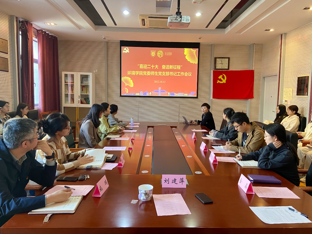 2022年10月13日,环境学院党委召开"喜迎二十大,奋进新征程"师生党支部书记工作会议,学院党委书记刘建萍、党委秘书、专职组织员、辅导员以及全体师生党支部书记参加会议。会议由学院专职组织员金晶主持。