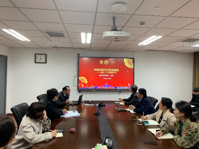 商学院葛扬教授应邀以《中国式现代化发展道路》为题做学习贯彻党的二十大精神专题讲座,讲座由党支部书记、财务处处长黄力主持,全体党员同志参会。