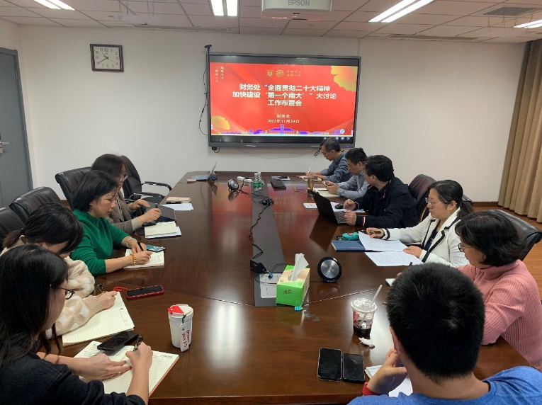 11月15日,凯发k8官网在仙林校区召开"全面贯彻二十大精神 加快建设‘第一个凯发’"大讨论动员会。会后财务处高度重视、迅速行动,成立由黄力处长牵头的大讨论工作小组,制定《财务处"全面贯彻二十大精神 加快建设‘第一个凯发’"大讨论活动实施方案》,扎实有力推进大讨论活动走深走实。