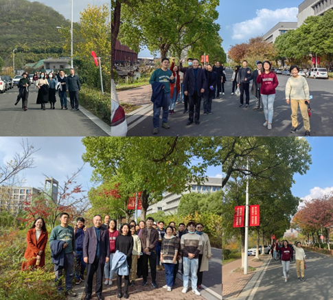 中午一点,本次健身行活动在仙林校区校园内举行,参加活动的四十余位教职工在侨裕楼前合影留念后开始环校园行走,共同见证仙林校区日新月异的变化。在院旗的指引下,老师们走过气势磅礴的镇江楼,经过正在进行运动会彩排的第二运动场,穿过亭台楼阁小桥流水的"香雪海",一路领略独属于这个季节特有的五彩斑斓的校园风景。大家边走边交流工作、学习和生活的点点滴滴,时而停下脚步与校园里红色的枫叶、金黄的银杏、绿色的香樟合影,健身行的路上洒满了欢声笑语。