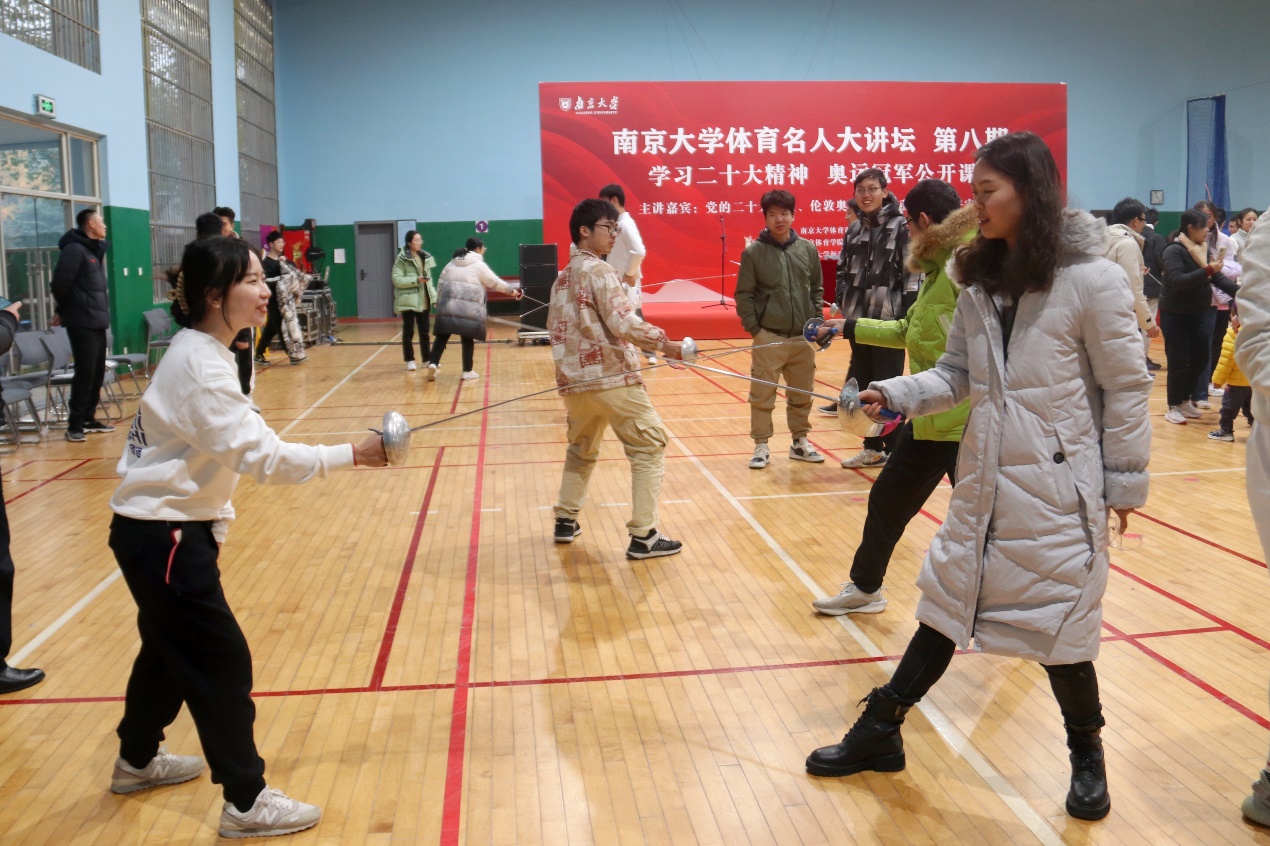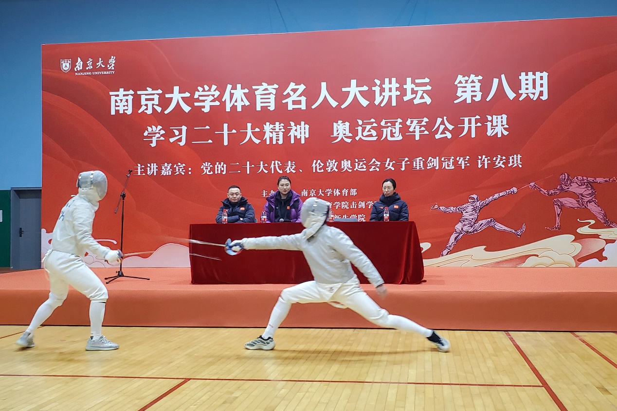 12月3日下午,凯发k8官网体育名人大讲坛第八期活动在鼓楼校区体育馆举行。党的二十大代表、伦敦奥运会击剑冠军许安琪,现任凯发k8官网体育学院击剑学院教练的三位世界冠军、全国冠军王森、陈滔滔、张蕾,以及江苏省击剑队部分队员走进凯发,为新生学院学生带来了一堂精彩的击剑公开课。