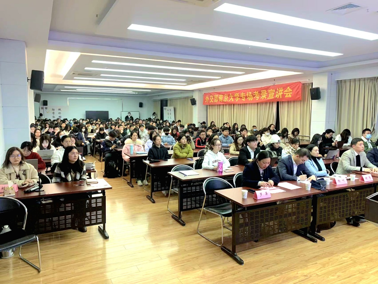 当晚的外交部考录宣讲会上,唐松根大使从国际形势、中国外交和外交官的能力要求等三个方面作主题报告。他分析了当前世界百年未有之大变局,立足祖国的强盛和伟大复兴事业,阐释了中国外交的基本原则,展示了中国外交战线的使命与担当。他说,世界之变、时代之变、历史之变正以前所未有的方式展开,我国外交事业面临史无前例的机遇和挑战,外交领域舞台广阔、大有可为。他希望同学们增强学习能力、树立斗争意识、不断充实自我,将自己锻造成为政治过硬、本领高强的新时代青年,将来积极投身人类和平与发展的崇高事业。