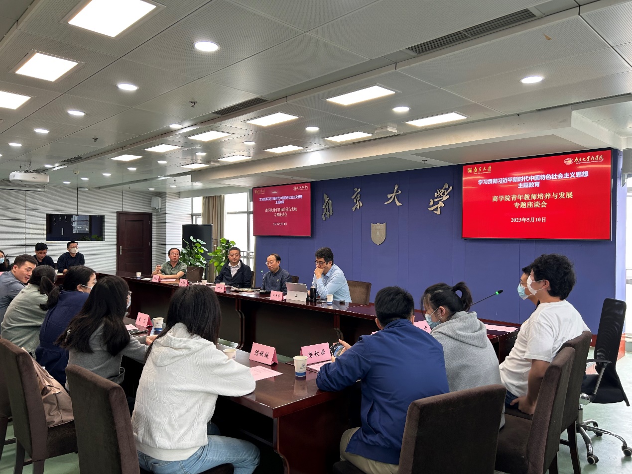 为深入开展学习贯彻习近平新时代中国特色社会主义思想主题教育,全面推进"奋进行动",更好地关心青年教师发展与成长,听取他们对学院工作的意见和建议,5月10日上午,商学院党委组织召开青年教师培养与发展专题座谈会。党委书记刘春林、院长安同良、党委副书记王宇伟、党委青年委员张正堂与各系青年教师代表参加会议,刘春林主持会议。