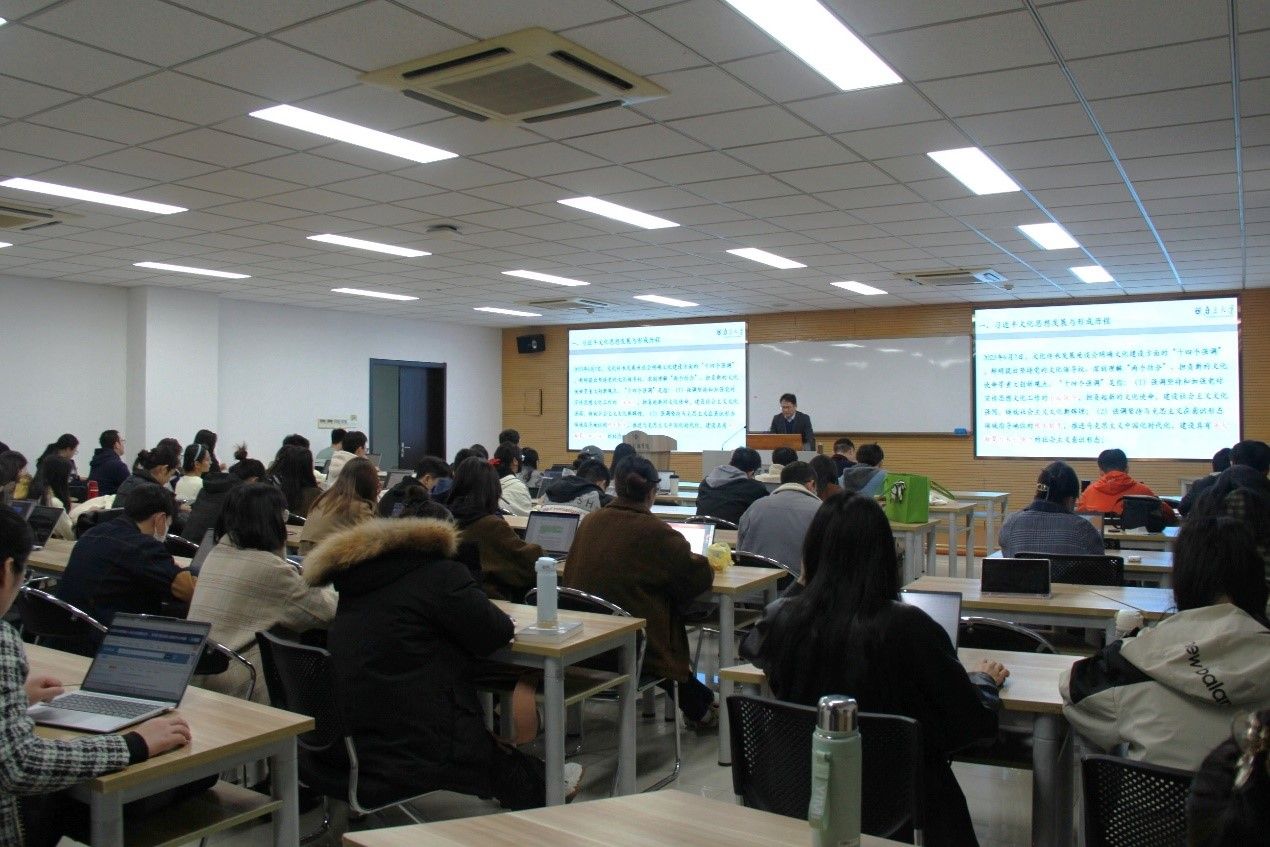 2023年11月22日晚,政府管理学院与国际关系学院党委邀请学校理论讲师团成员、马克思主义学院副院长陈建教授于圣达楼讲授“弘扬习近平文化思想,切实提升意识形态水平和能力”主题党课,学院近百余名师生党员参与学习,学院党委副书记周恒主持本次党课活动。
