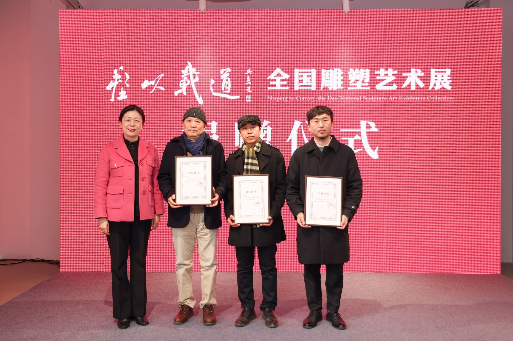 市文广旅游局党委书记、局长、二级巡视员蒋蕴洁为陈钢、王超、刘权三位作者代表颁发收藏证书并合影留念。