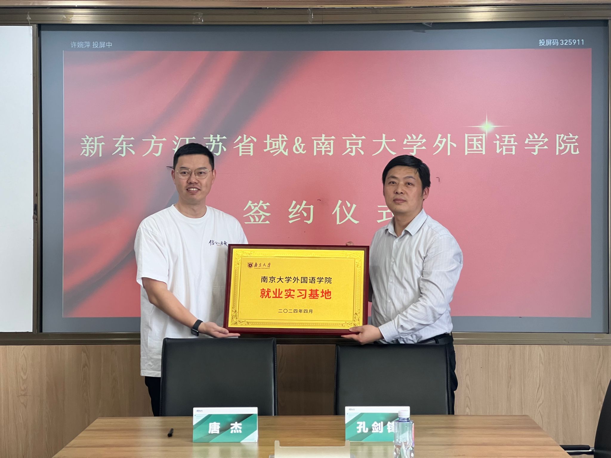 为贯彻落实"奋进行动",持续推进和全面深化与重点实习就业单位合作,实现供需对接,拓展毕业生就业渠道与实习就业岗位,2024年4月23日下午,外国语学院党委副书记孔剑锋一行赴新东方江苏省域开展访企拓岗,签署就业实习基地合作协议并授牌,本科生辅导员陈静、马宾、研究生辅导员魏晓伦以及20余名本研学生代表参加相关活动。