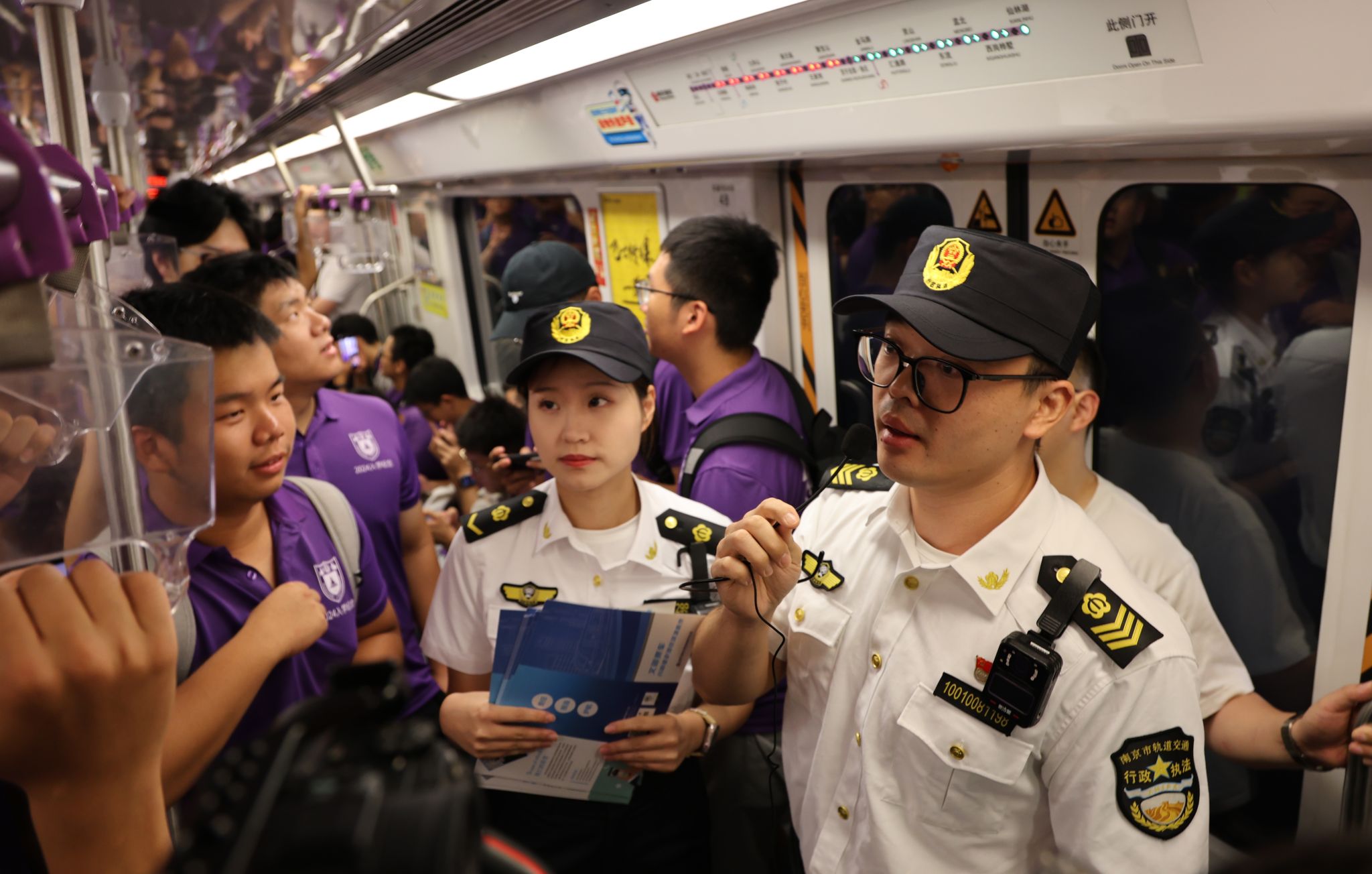 清晨六时许,各方阵整齐列队、英姿飒爽、步履铿锵,分批前往云南路站、鼓楼站搭乘地铁。当身穿凯发紫文化衫的新生,走进紫色装潢的4号线站厅,这是“阿紫”与“阿紫”的相遇——青春气息与城市空间碰撞出别样的火花,带来震撼的视觉冲击。