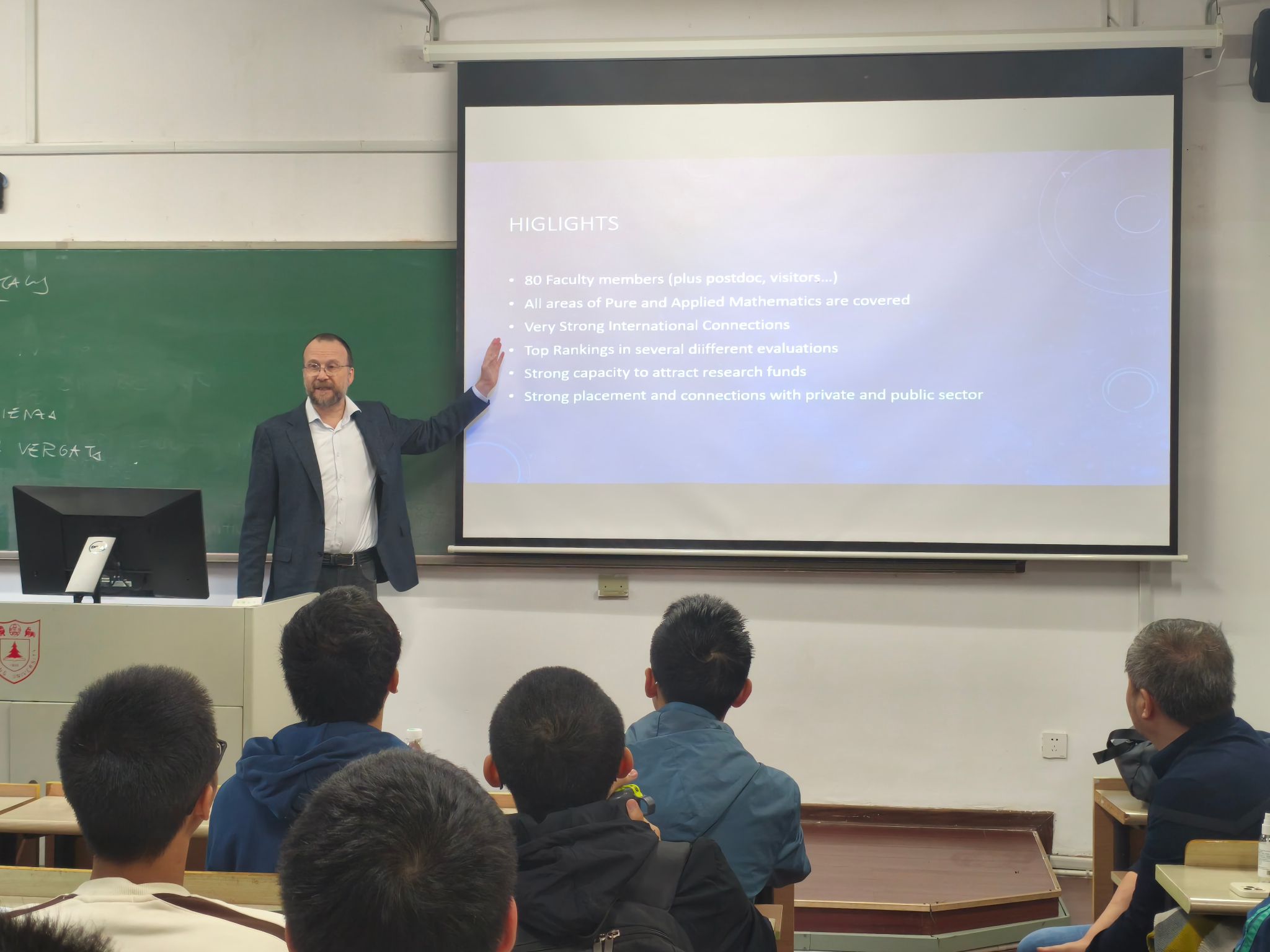 在这次访问中,Domenico Marinucci教授还与我院党委书记刘公祥和副院长杨俊锋会面,互相交流了在办学理念、科学研究和人才培养等方面的经验,深入探讨了合作事宜和未来合作的方向。此外,Domenico Marinucci教授面向我院师生对合作项目进行宣讲和座谈,并作了题为“The geometry of random eigenfunctions”的综合报告。